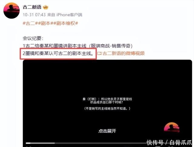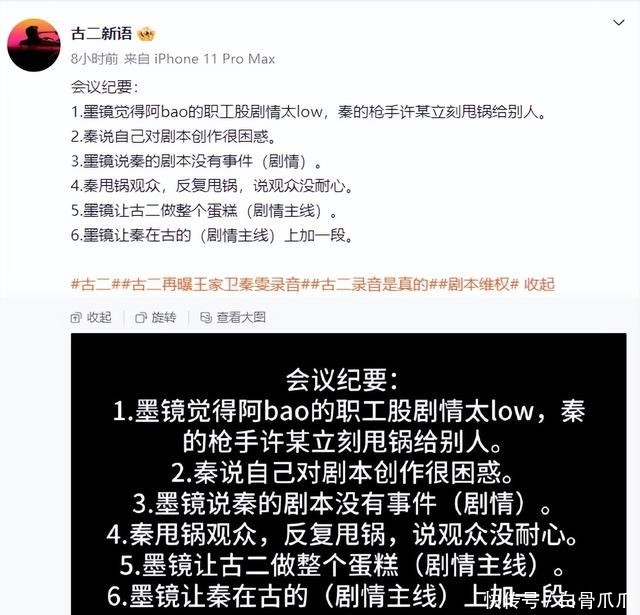 心中的公平11月14号凌晨,古二再次放出了一些录音,这段录音并没有什么太过炸裂的东西,全都是在证明获奖剧本他才是主要创作者。